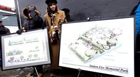 Supporters of a memorial for victims of The Station fire display an artist rendering in West Warwick, R.I., in February. The project is estimated to cost $1.4 million but supporters have raised less than $200,000.